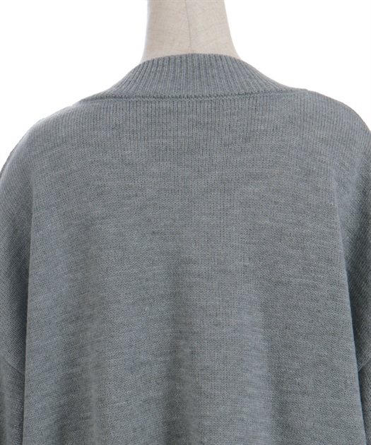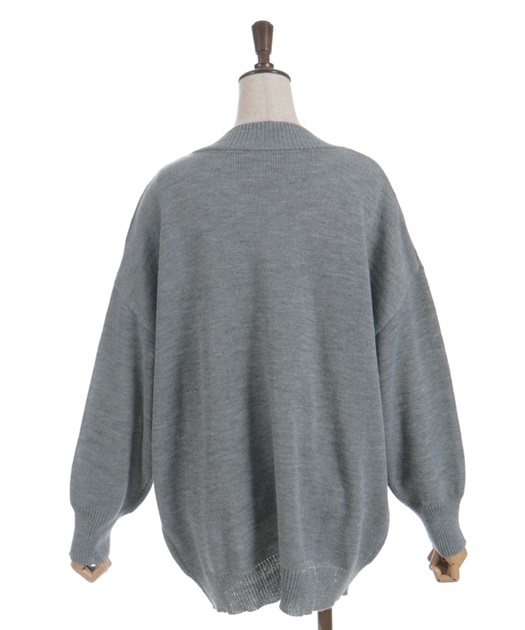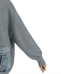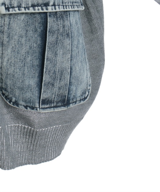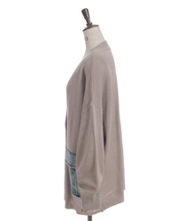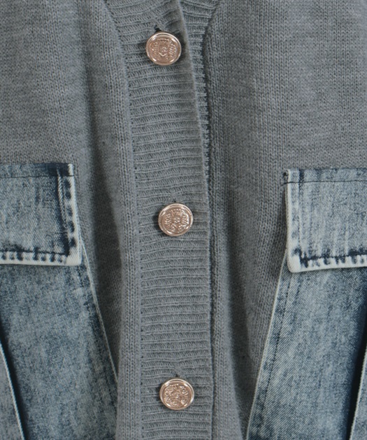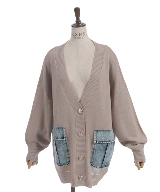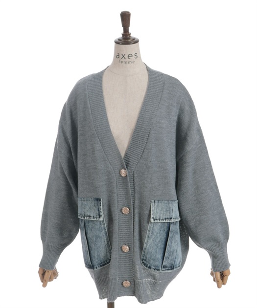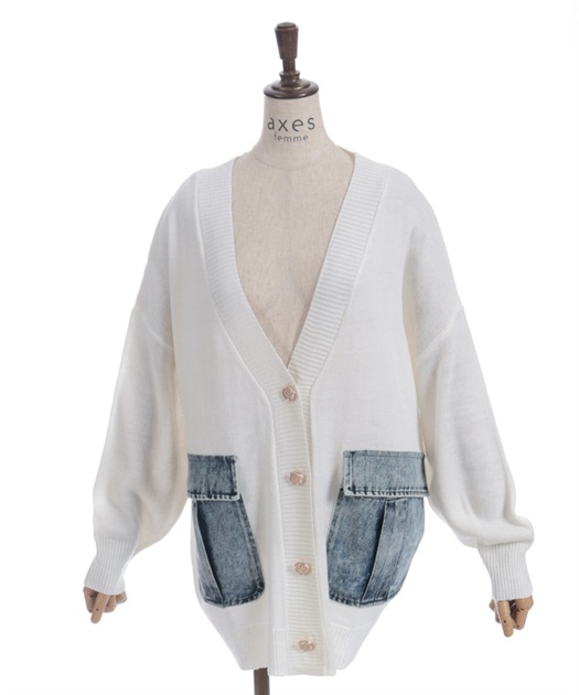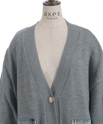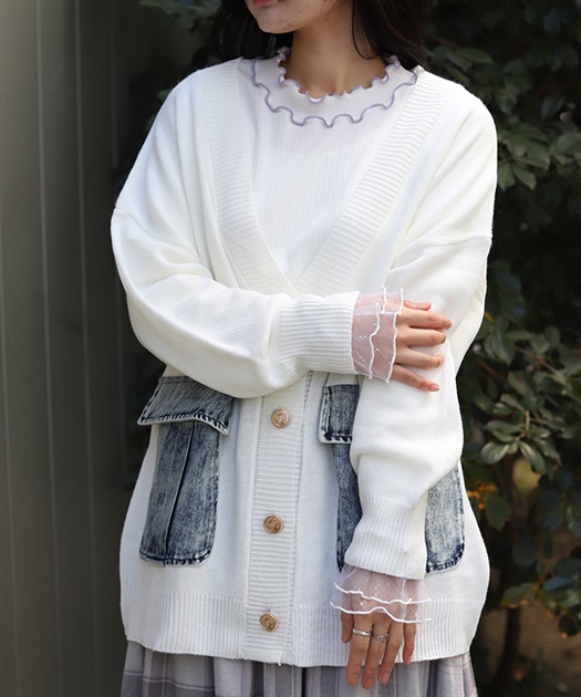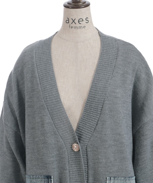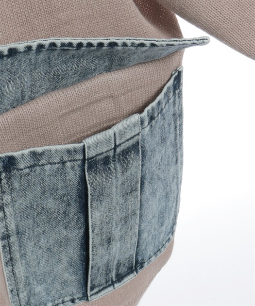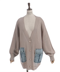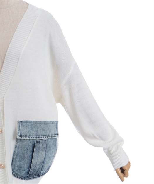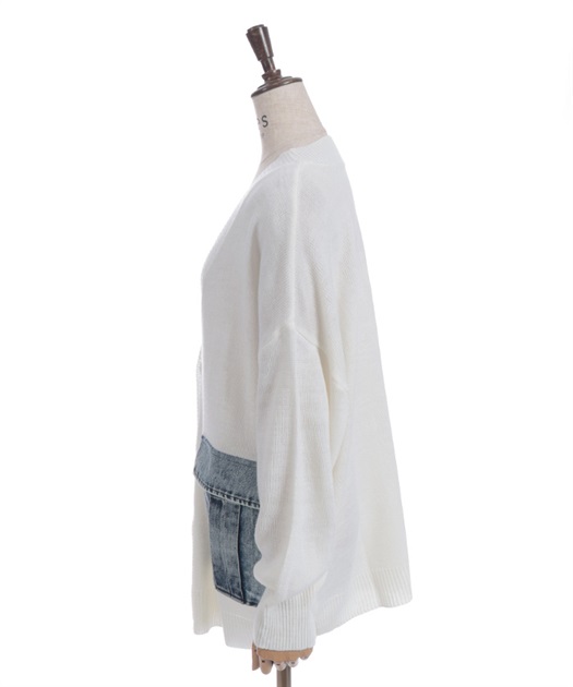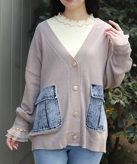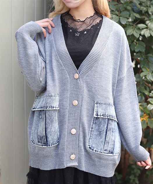シンプルなニットカーディガンにデニムポケットを組み合わせ、異素材のコントラストがさりげない個性を演出します。ゆったりとしたシルエットで羽織りやすく、デイリーに取り入れやすい一着です。