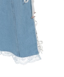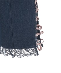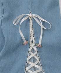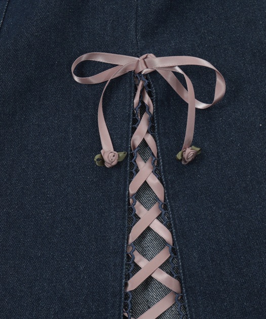 裾に向かって広がるフレアシルエットが美しいラインを描く一着。裾にはレースフリルをあしらい、サイドにはスリットとサテンリボンのレースアップを施して印象的なアクセントに仕上げました。ポケットにはサテンリボンのローズやレースリボンを添え、後ろポケットにはレースを重ねるなど、細部までこだわりを感じる華やかなデザインです。