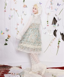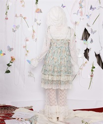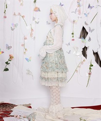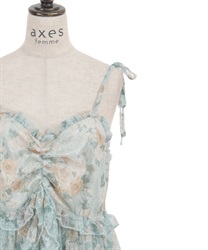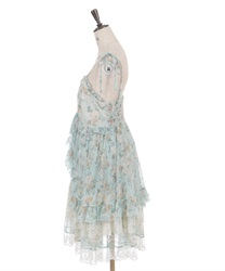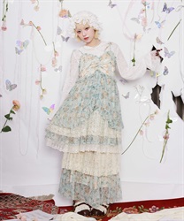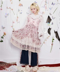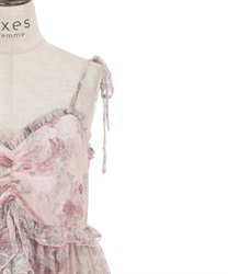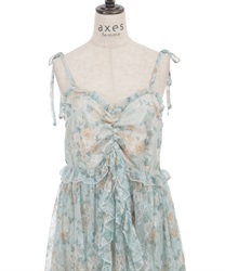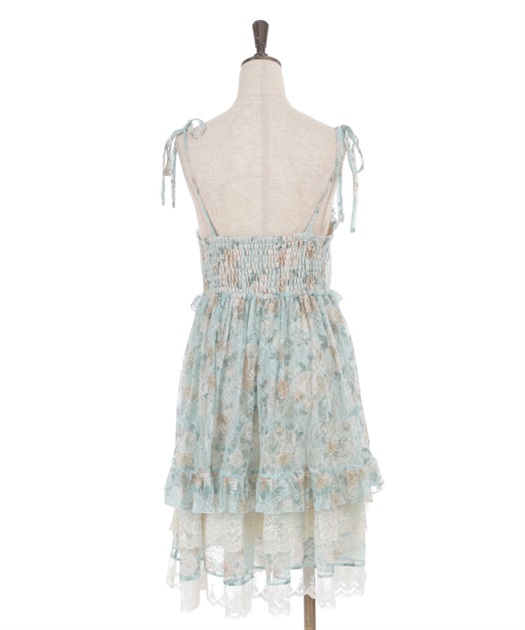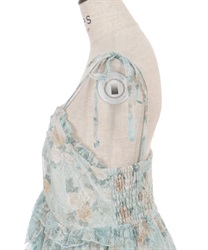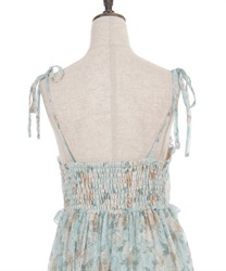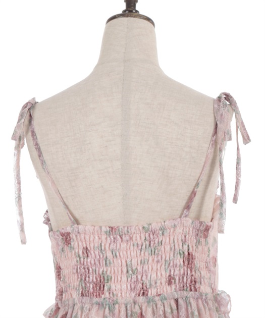 オリジナルのフラワー柄をあしらい、ふんわりと広がるボリュームシルエットが思わずくるくると回りたくなるような華やかなラインを描きます。背面はシャーリングゴム仕様でフィット感のある着心地に。肩リボンは調整可能で、バランスに合わせて着丈を変えられるのも嬉しいポイントです。