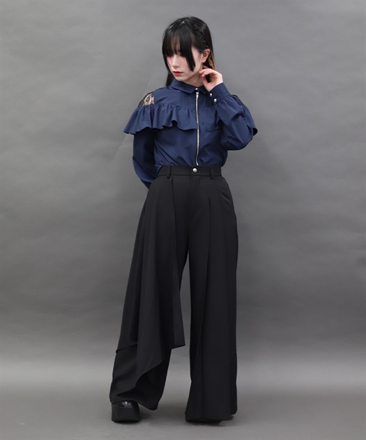 アシンメトリーなサイドフレアデザインでモードな雰囲気に仕上げました。