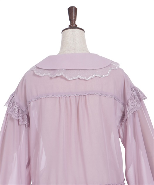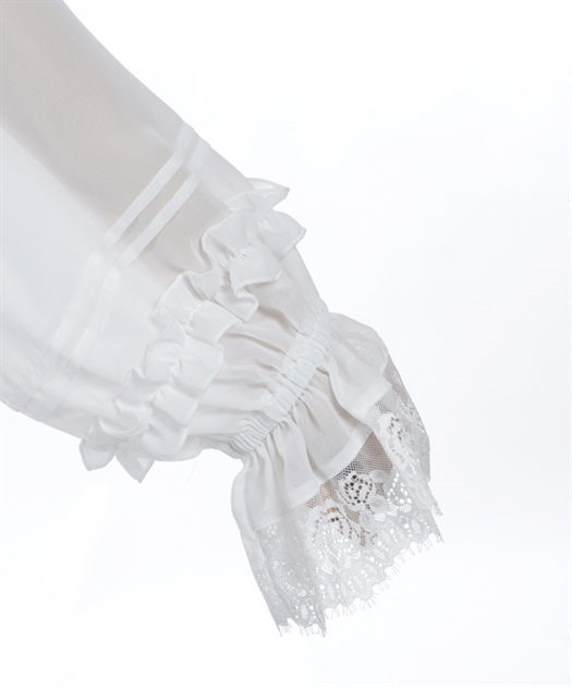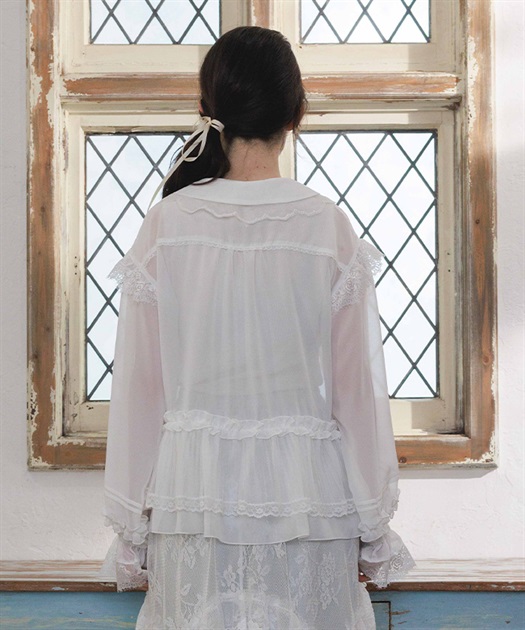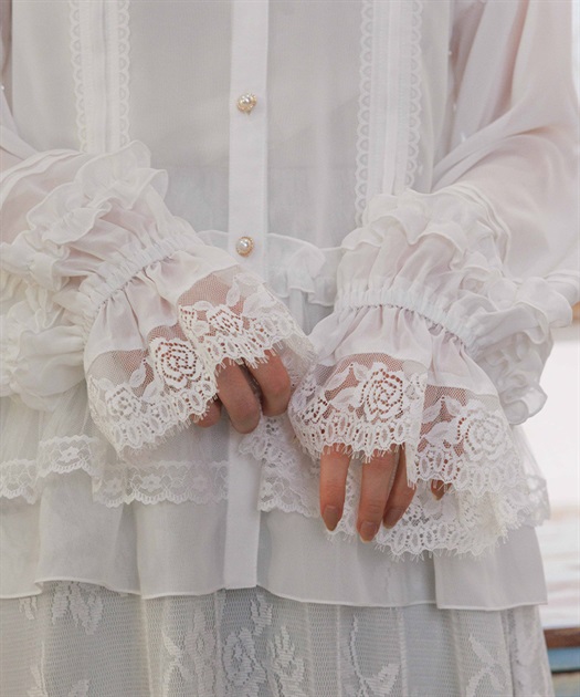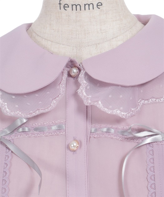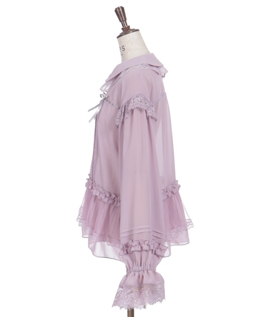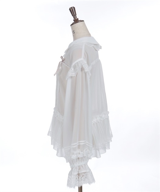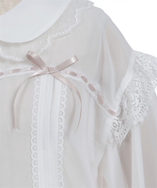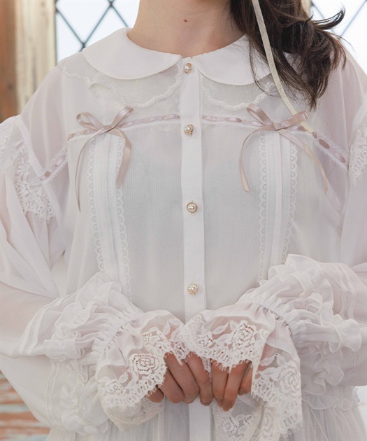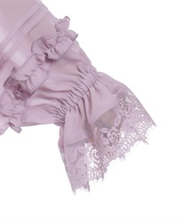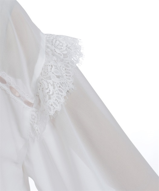 フロントや裾にあしらったレーシーなディテールがフェミニンな印象、袖のリボンデザインが可憐なアクセントに。きちんと感のあるシルエットで、甘さと上品さをバランスよく楽しめる一着です。