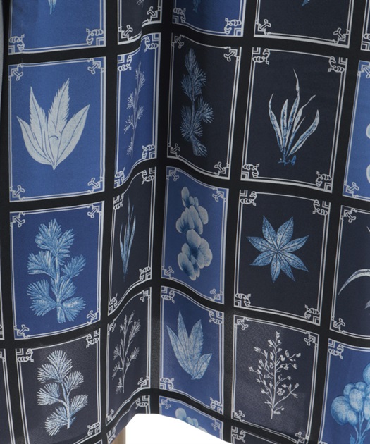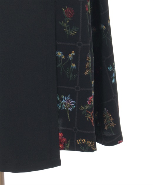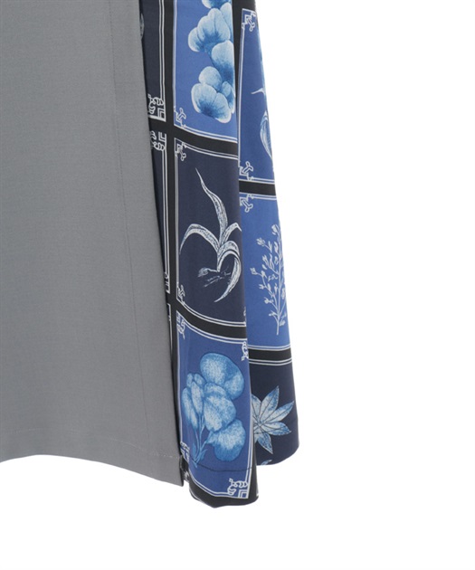 無地とプリントを大胆に切り替えることで、動くたびに印象が変わるシルエットに仕上げています。落ち感のある素材が広がりすぎず、モード感と上品さをバランスよく両立した一着です。