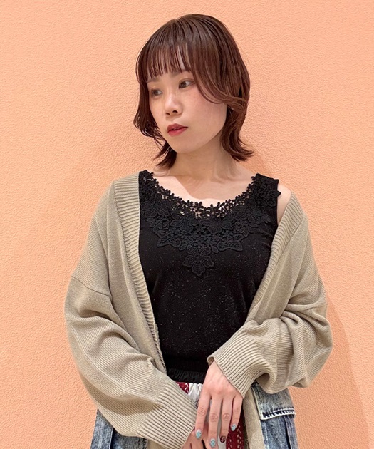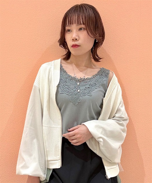 シアーシャツや羽織のインナーとして合わせると、レースがアクセントになり上品な印象に。ミニ丈ボトムを合わせてチュニックやロングトップスを重ねれば、バランスよくこなれたスタイルが完成します。1枚持っておくと季節を問わず活躍します。