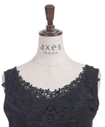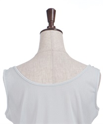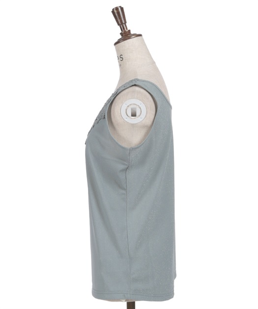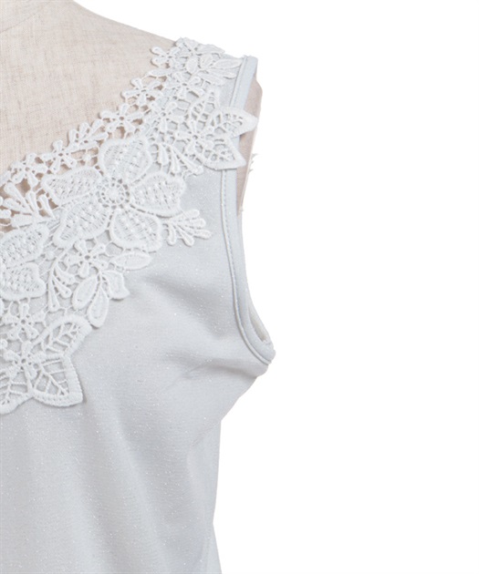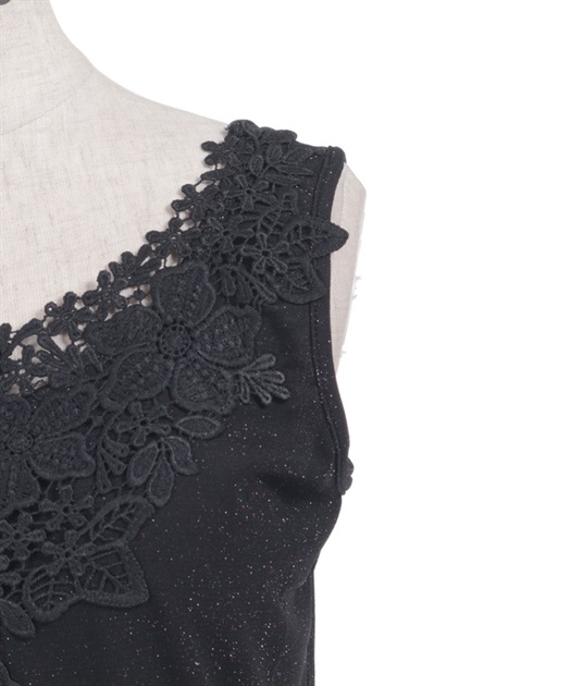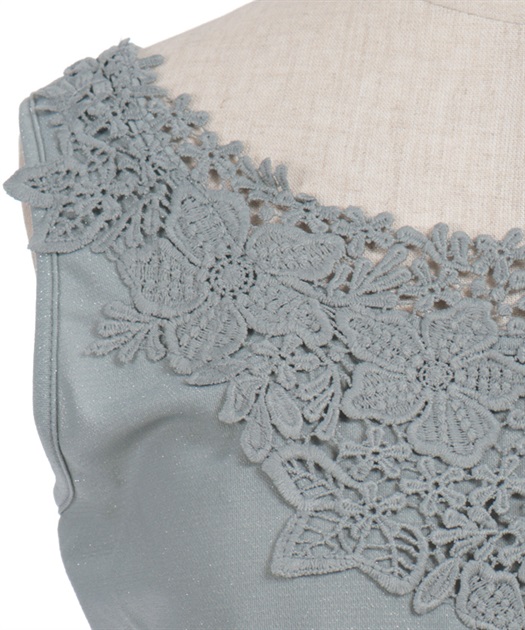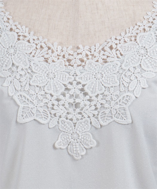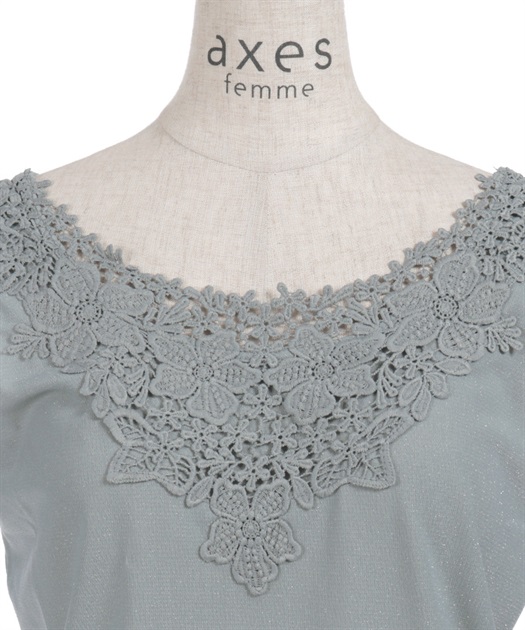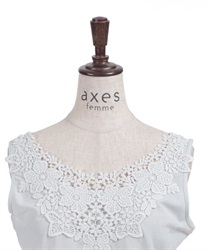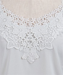 胸元から肩にかけてあしらった立体感のあるレースがポイント。デコルテをきれいに見せつつ、ほどよい肌見せで抜け感を演出します。すっきりとしたシルエットで重ね着してももたつきにくく、きれいめにもカジュアルにも馴染みます。