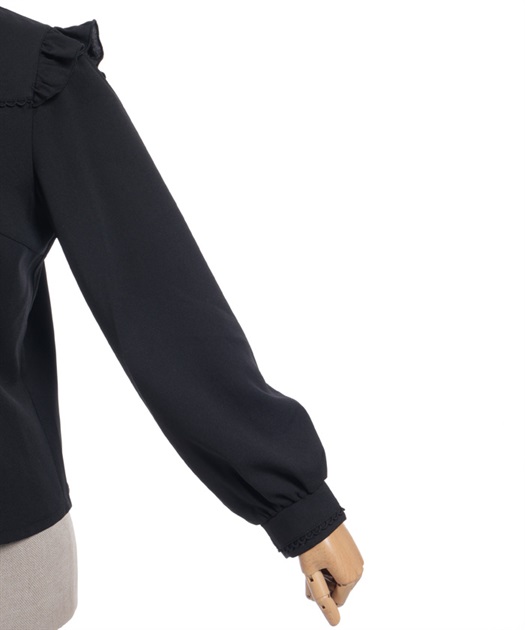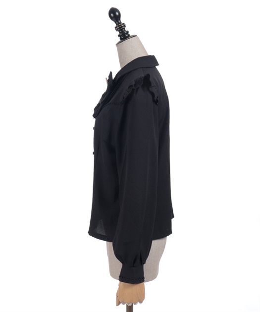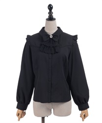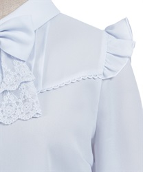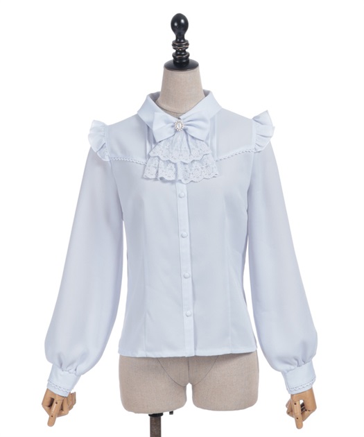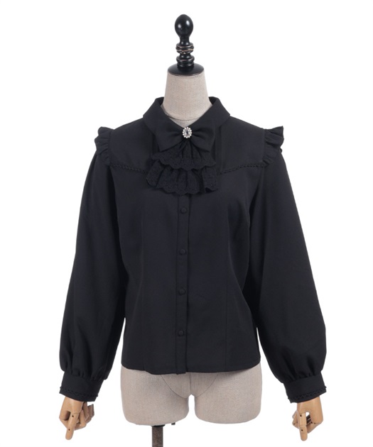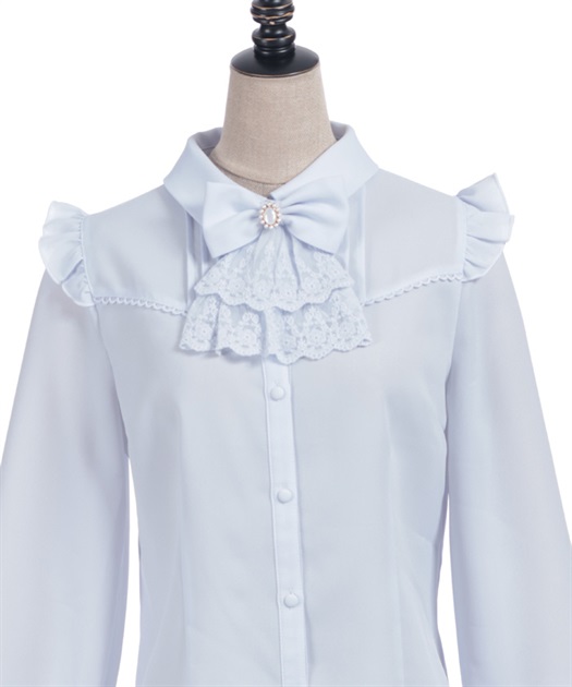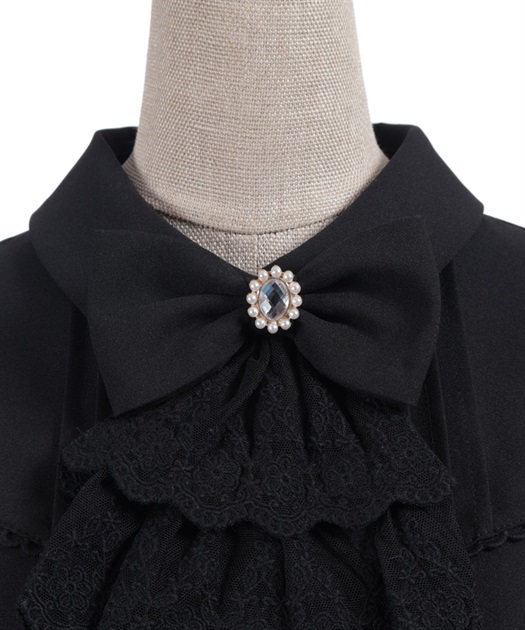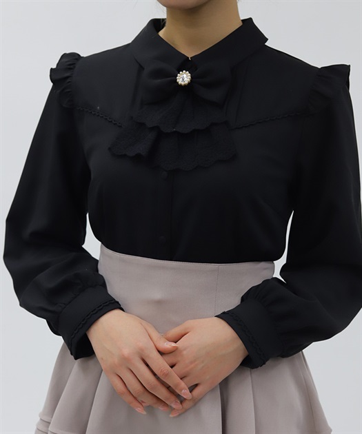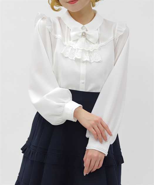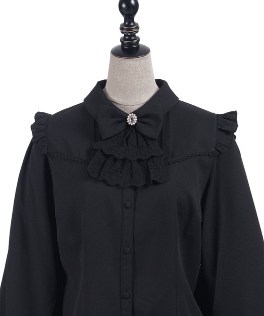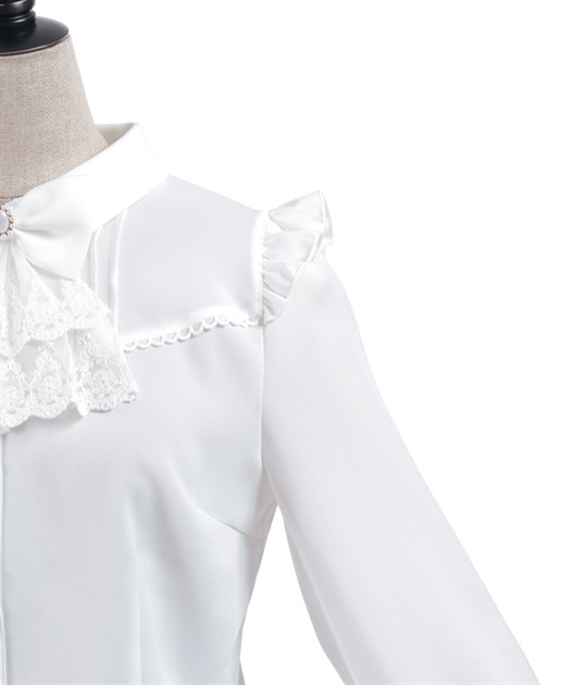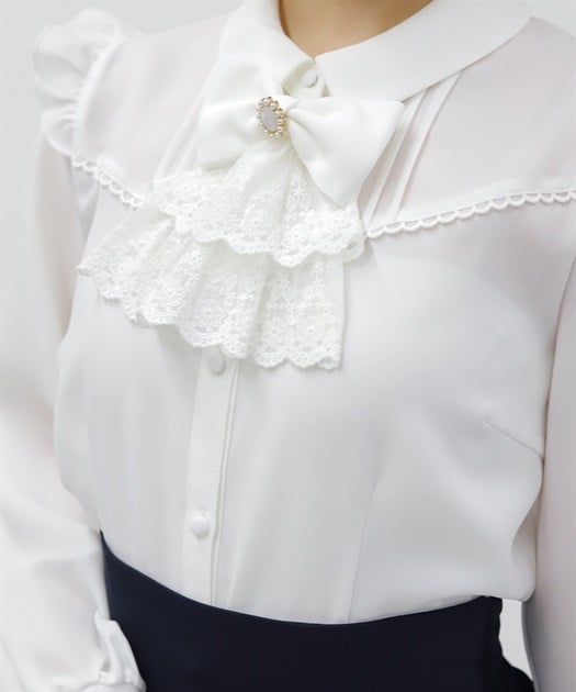 レースフリルが立体感のある、リボンジャボのブローチがセットになったブラウスです。