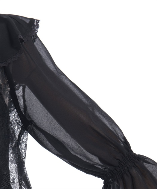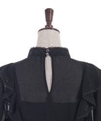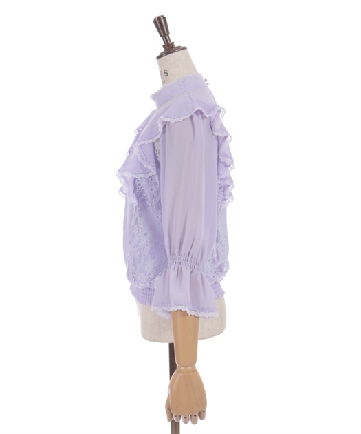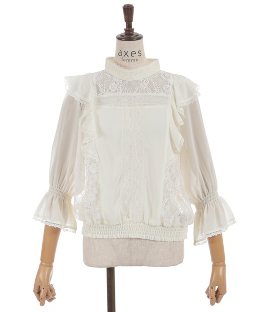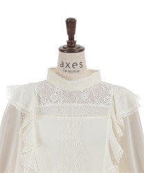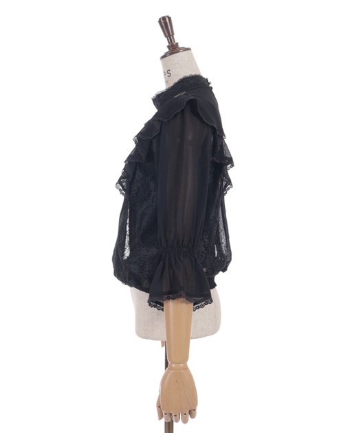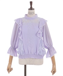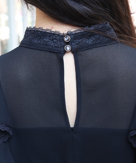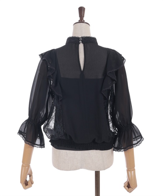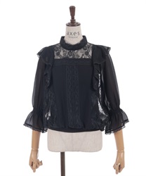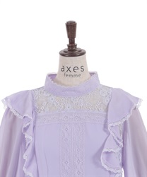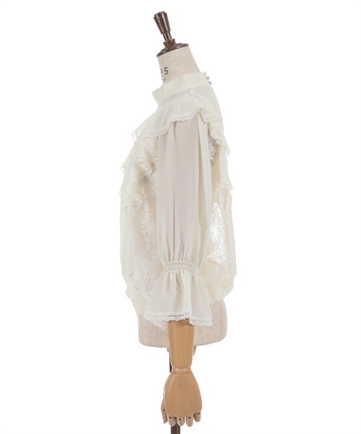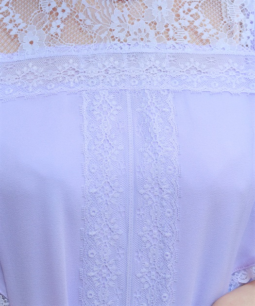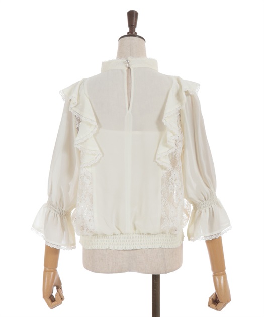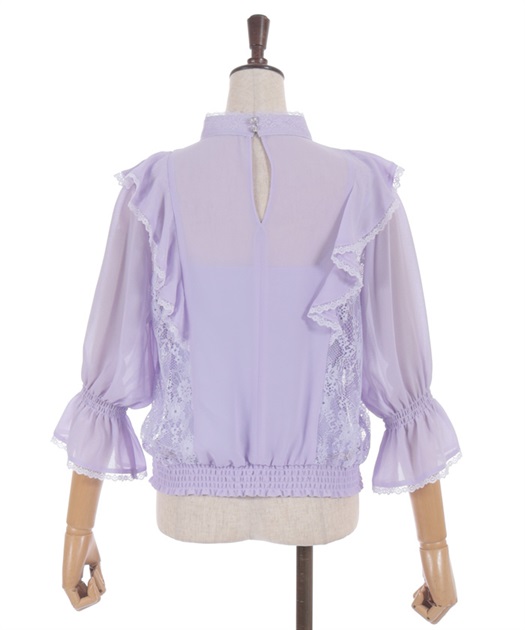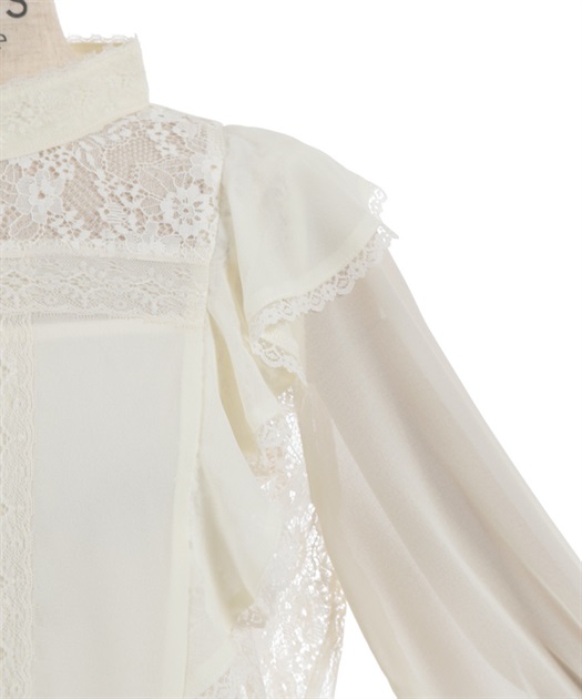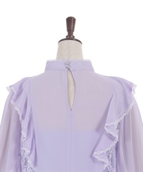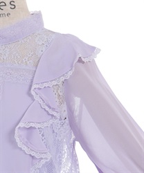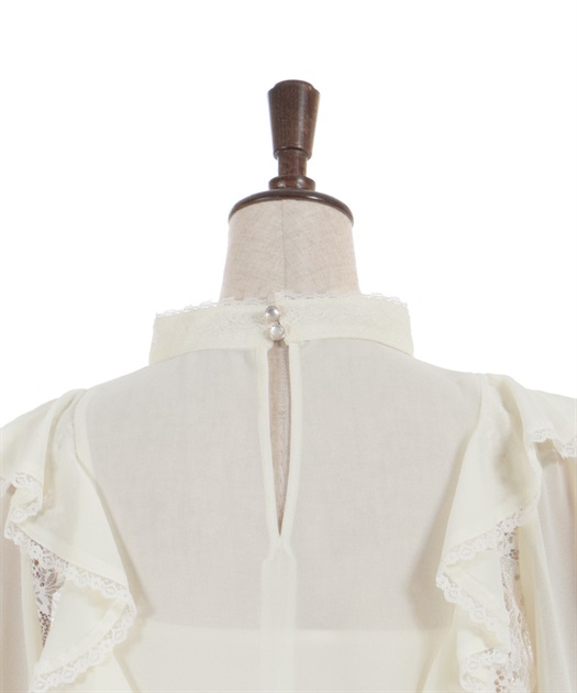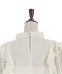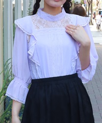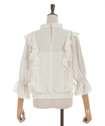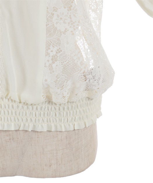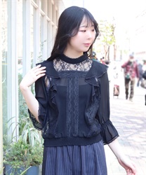 フロントやヨーク部分にあしらったレースが、上品でやさしい表情を引き立てる一着。縦に流れるフリルディテールが程よい華やかさを添え、すっきりとした印象に仕上げています。七分袖の軽やかなバランスと、袖口のリボンデザインがさりげないアクセントに。インナーがセットになっています。