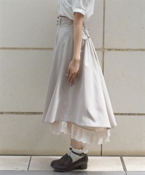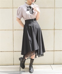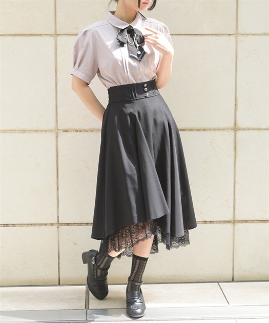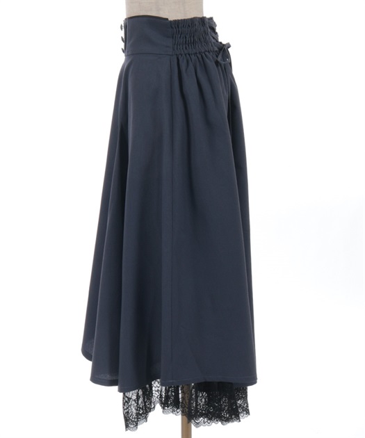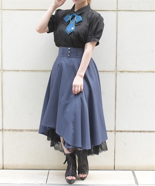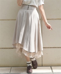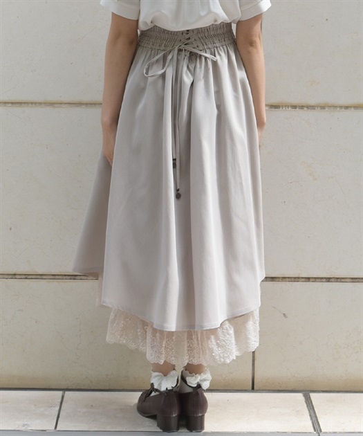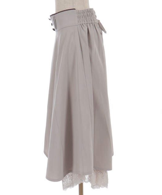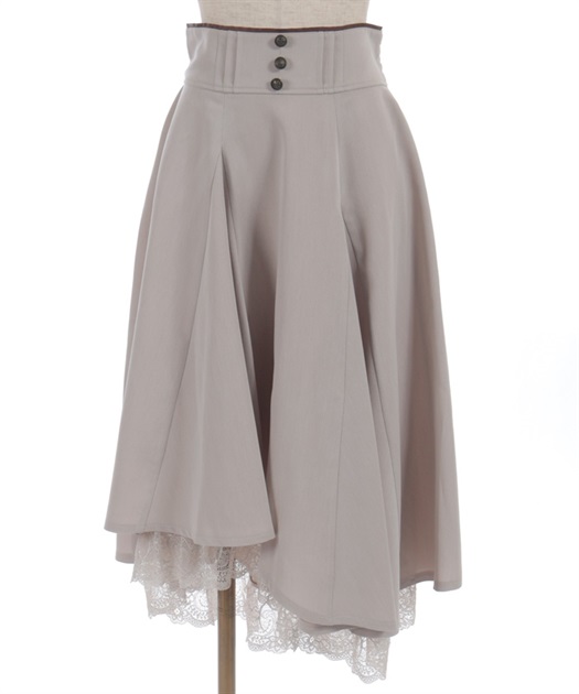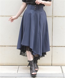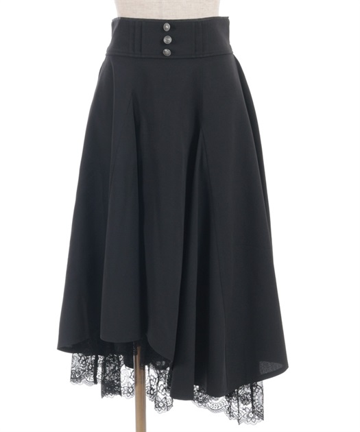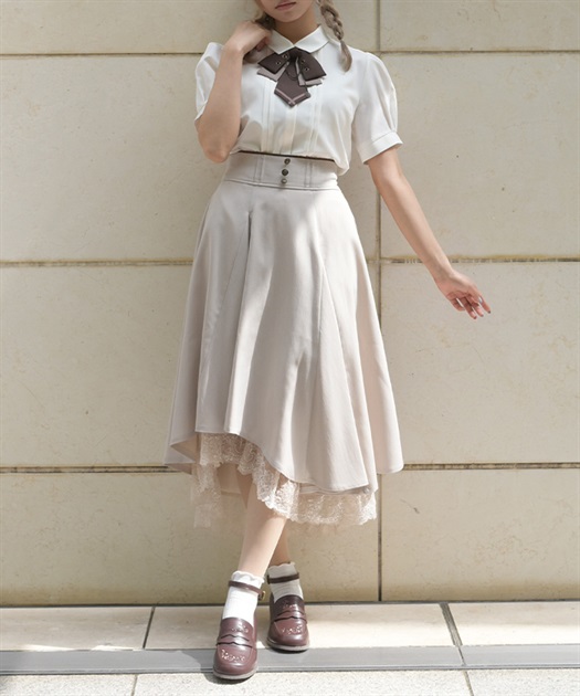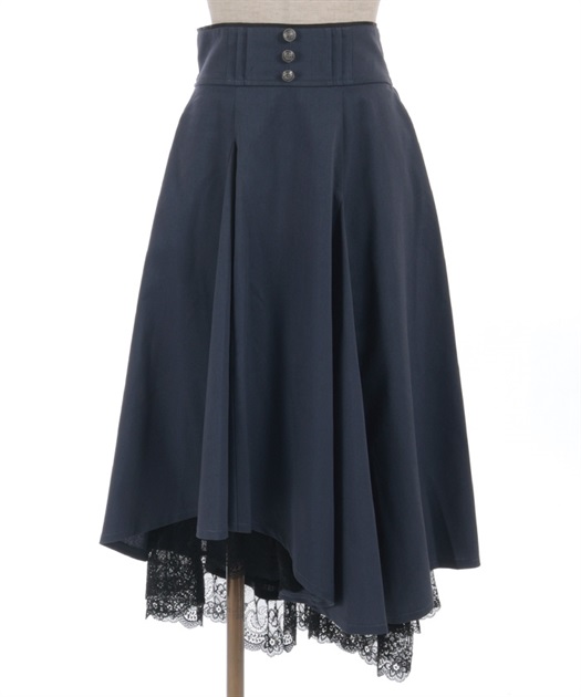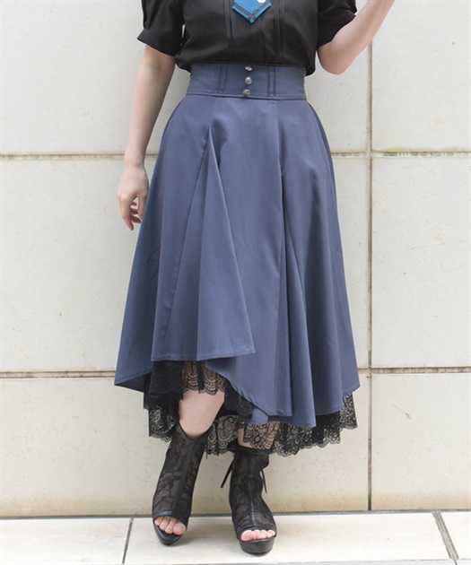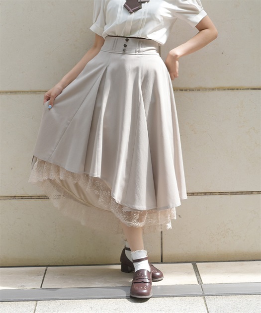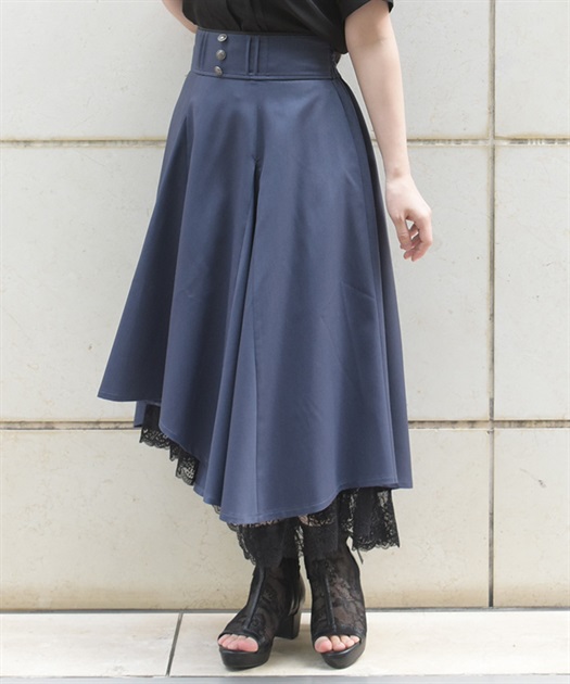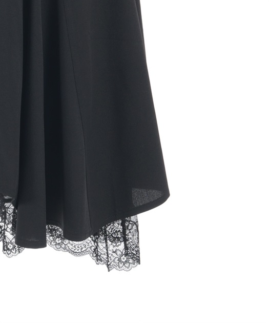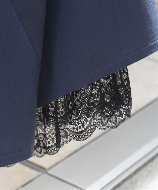 裾に向かって広がるラインとイレギュラーなヘムデザインが、軽やかな動きを演出する一着。裾から覗くレースがさりげない華やかさを添え、上品な雰囲気に仕上げています。ウエストのボタンディテールもアクセントとなり、全体を引き締めるポイントに。