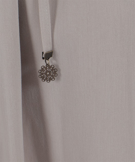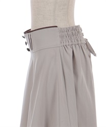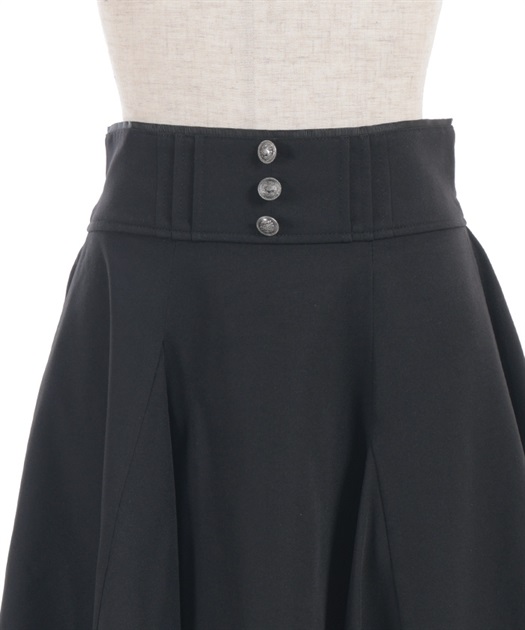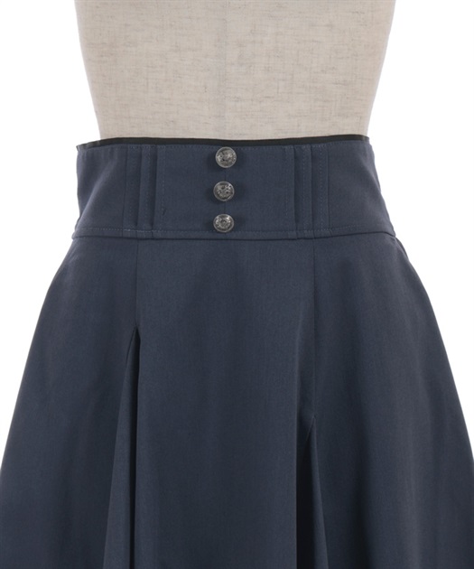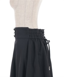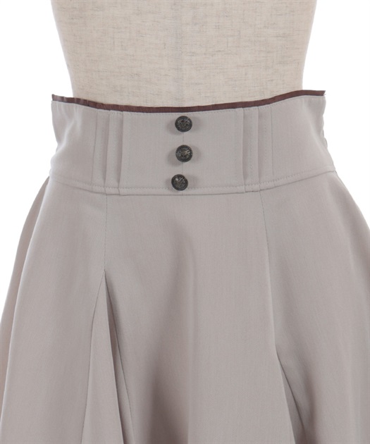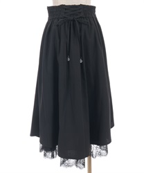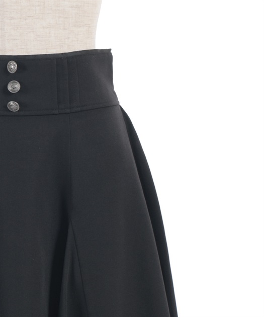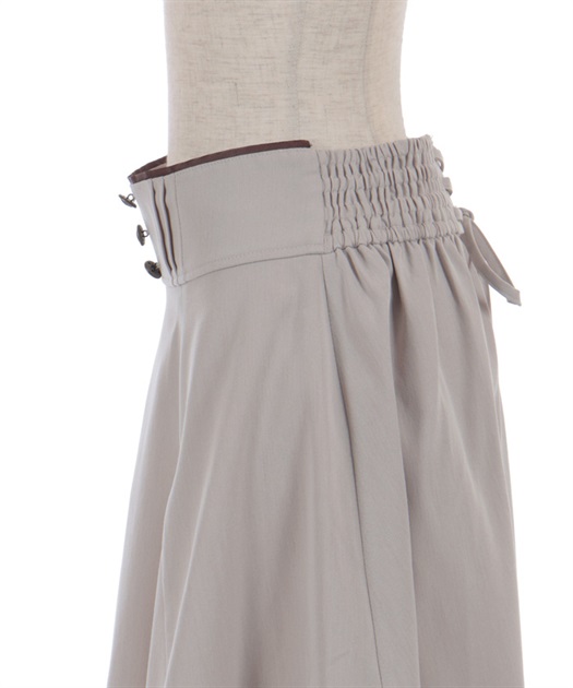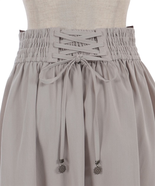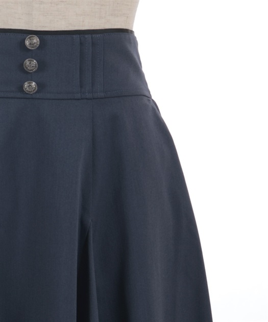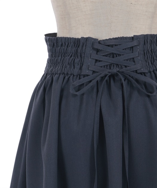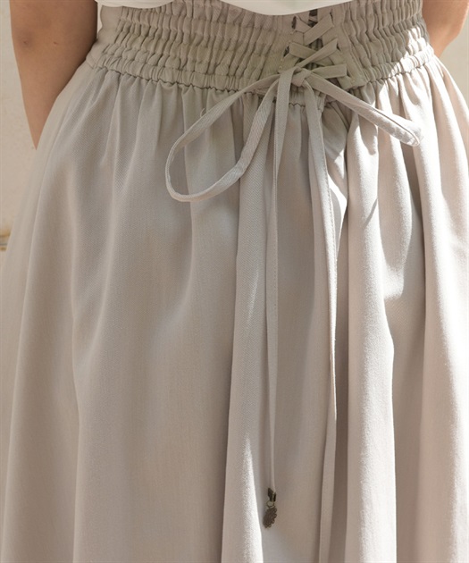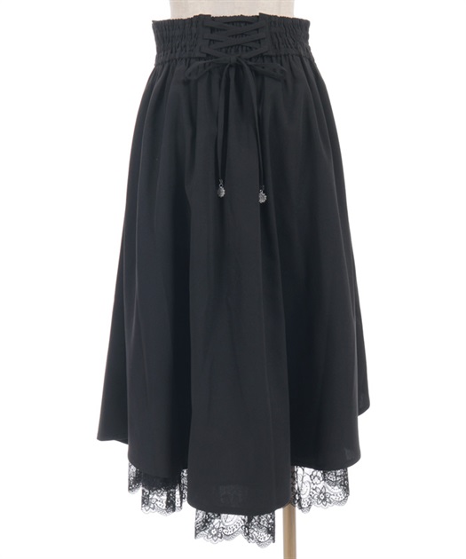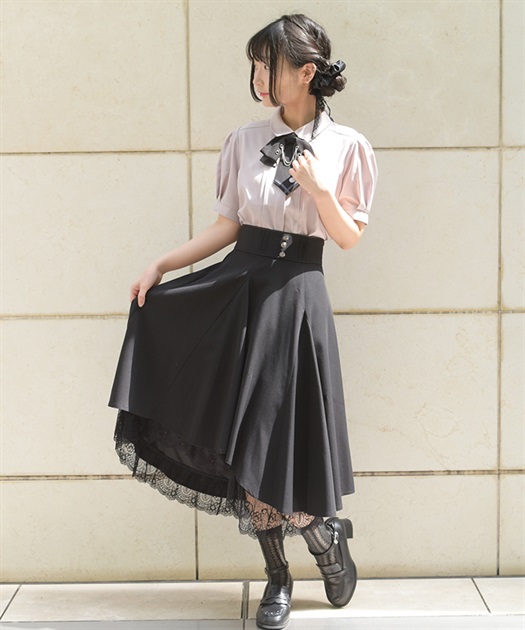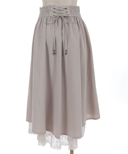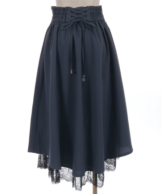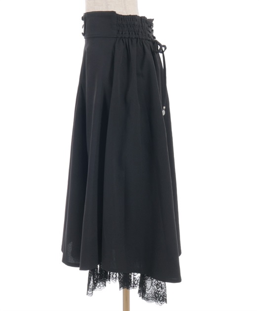 裾に向かって広がるラインとイレギュラーなヘムデザインが、軽やかな動きを演出する一着。裾から覗くレースがさりげない華やかさを添え、上品な雰囲気に仕上げています。ウエストのボタンディテールもアクセントとなり、全体を引き締めるポイントに。