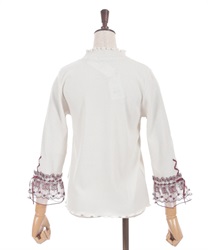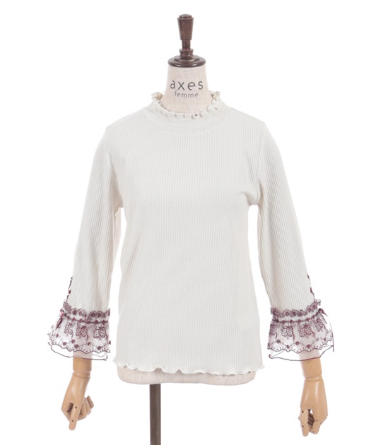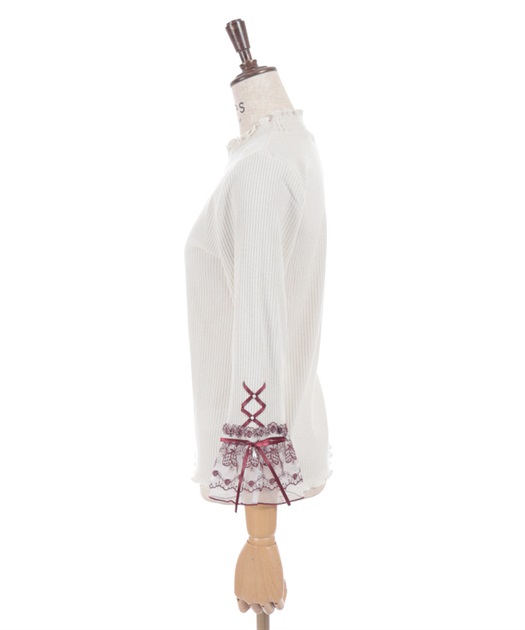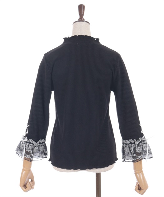袖口の苺刺繍のオーガンジーレースがポイントの七分袖トップスです。