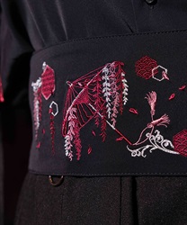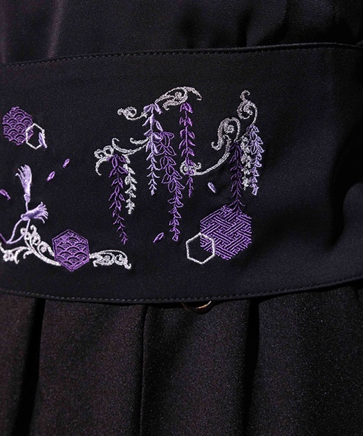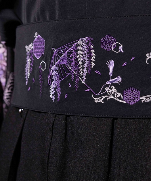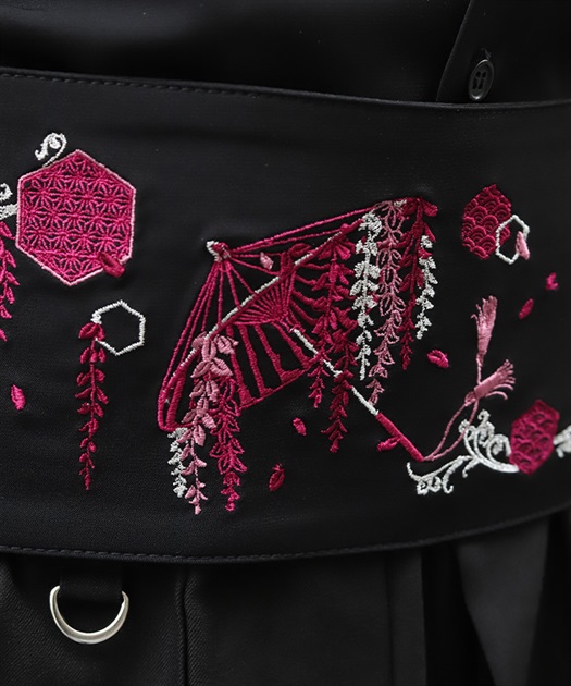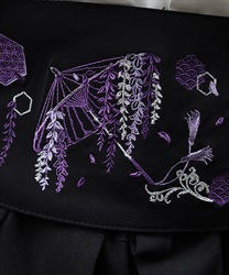 藤が和傘から溢れるほどに咲き誇る様と和柄のモノグラムを、複数色を使って刺繍で表現。