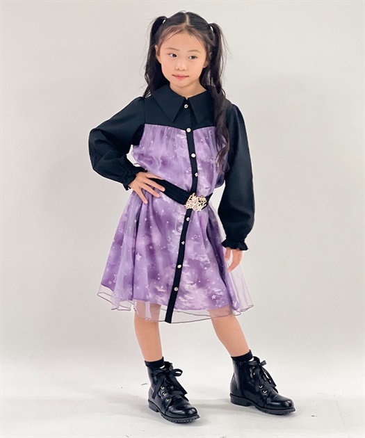 かっちりとした襟付デザインと、プリントに重ねたチュールが動くたびにふんわり揺れる特別感たっぷりのワンピース