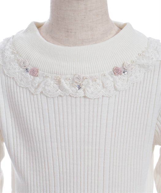 バラ柄のチュールレースの上にパール・ビーズを、襟ぐりにネックレスのように施した、装飾性の高いデザイン。