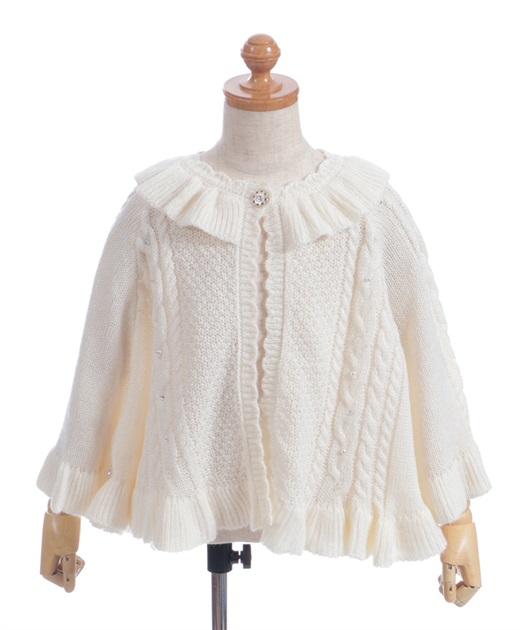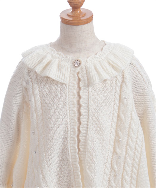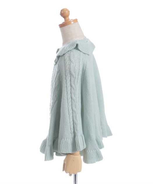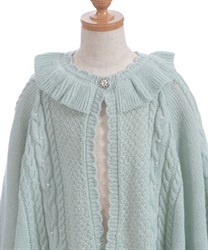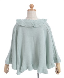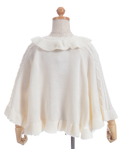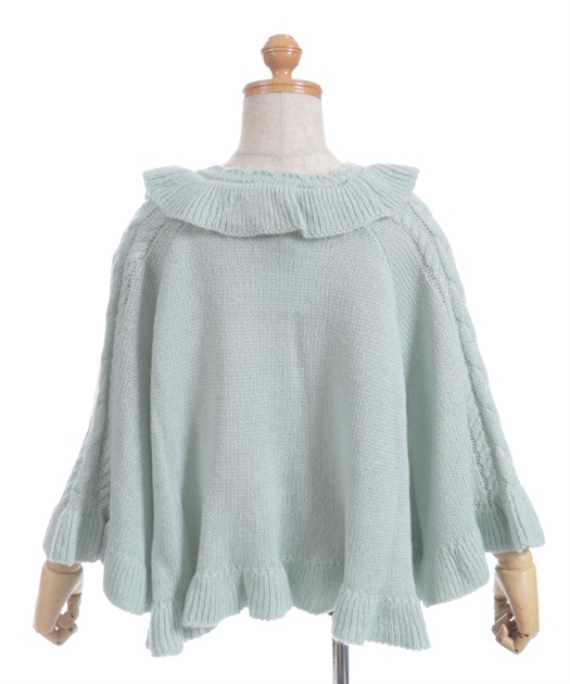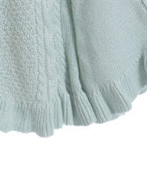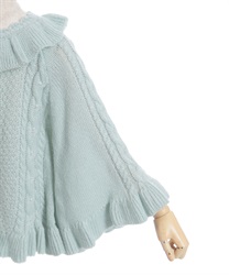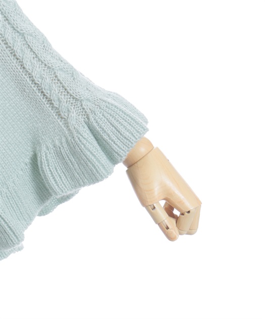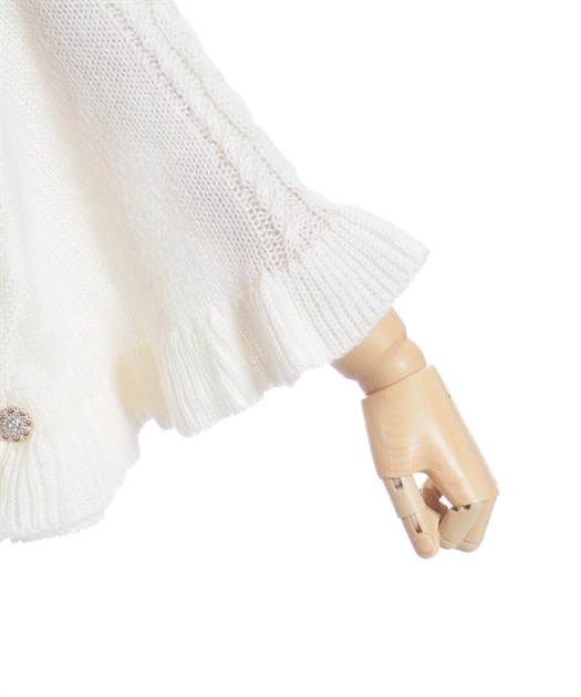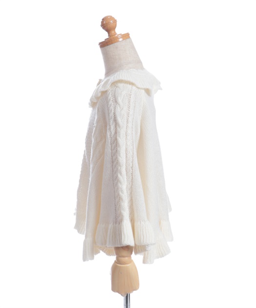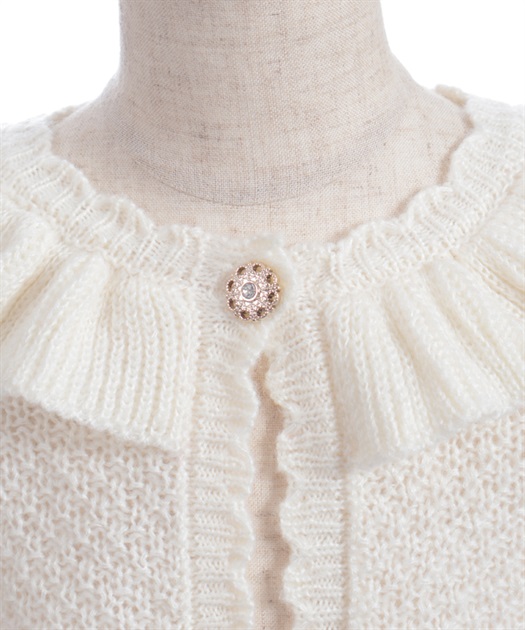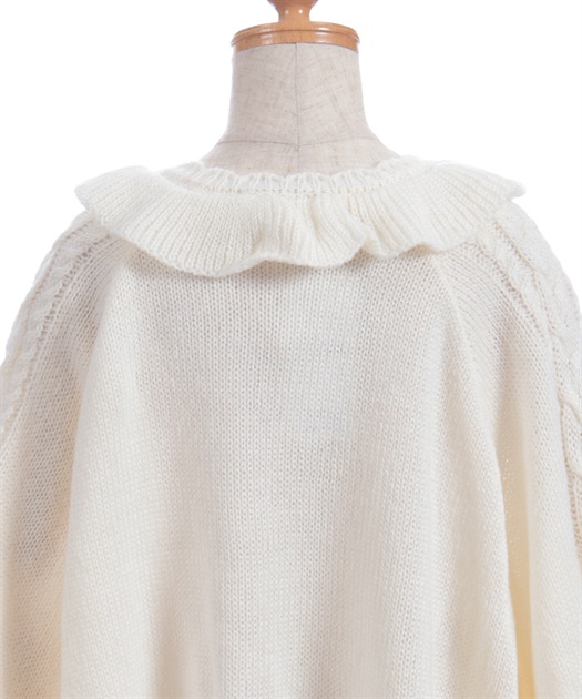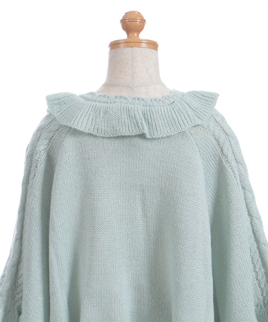 フリルのビッグ襟と、裾から袖にかけたニットあぜフリルの、ふんわり可愛らしいシルエットがポイント。