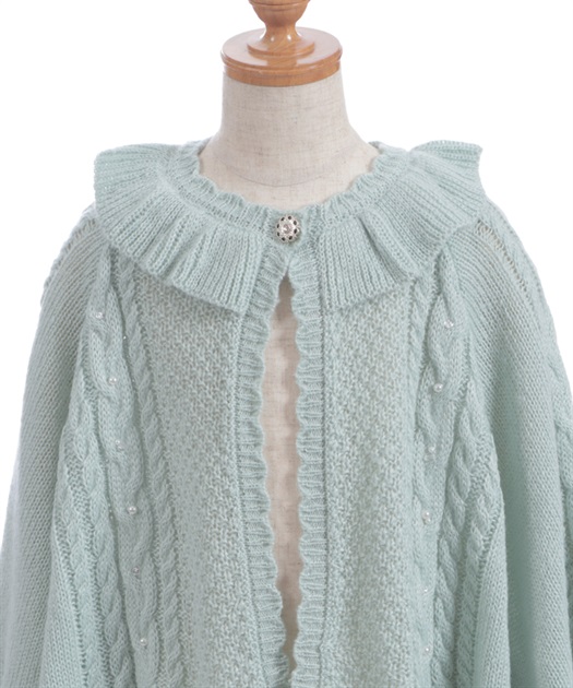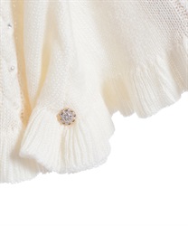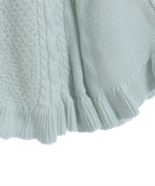 ケーブルに沿ってパール・ビーズをキラキラあしらい、ボタンも透かしタイプのキラキラしたものを使用した、こだわりポイントがぎゅっと詰まったデザインです。