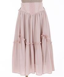 ジョーゼット生地を使用したコルセット風デザインのティアードスカートです。br>ティアード切り替えは大き目のスカラップになっており、サテンリボンがあしらわれています。後ろ身頃はシャーリングになっているので簡単に着脱が可能です。後ろリボンは取り外しができます。こちらは50cm丈パニエがオススメです。br>br>