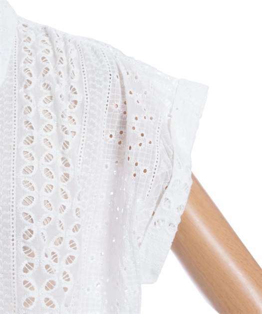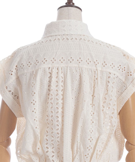 全体にあしらわれたかっとワークレースが目を引くデザイン。袖はフレンチスリーブで、二の腕カバーも◎
