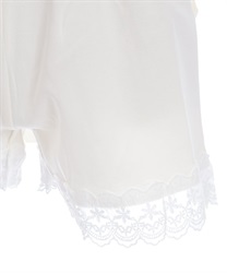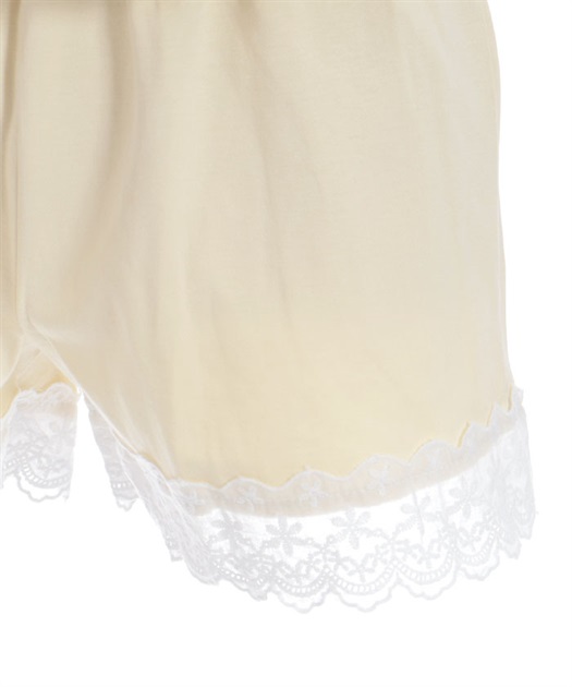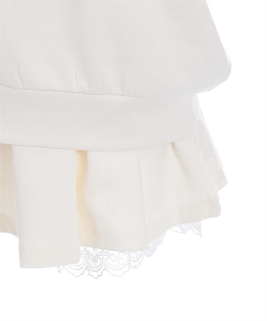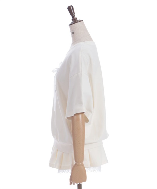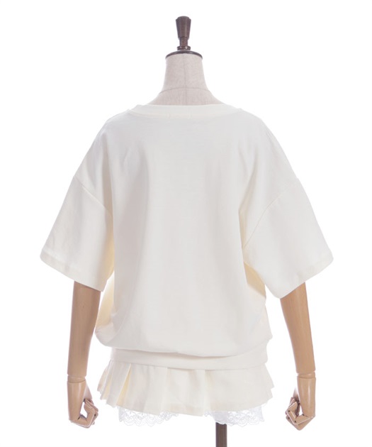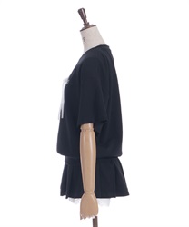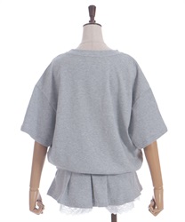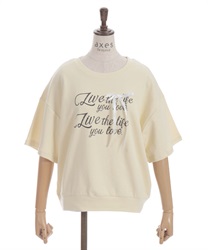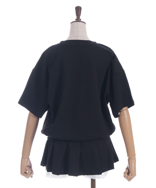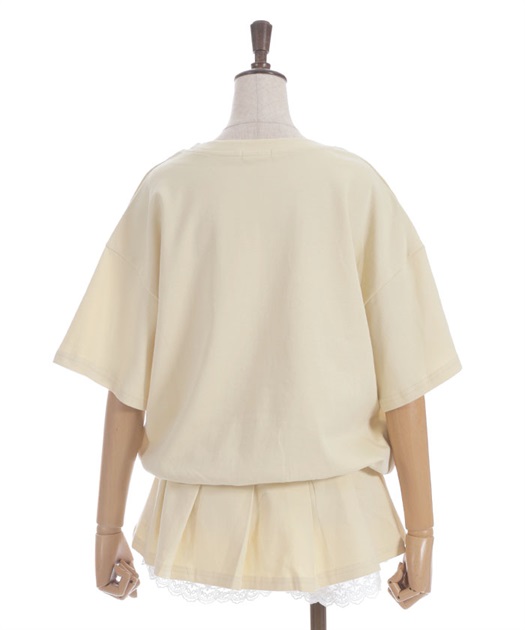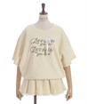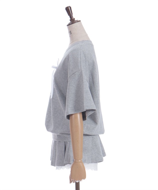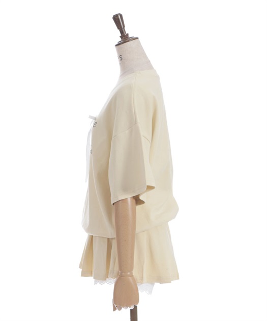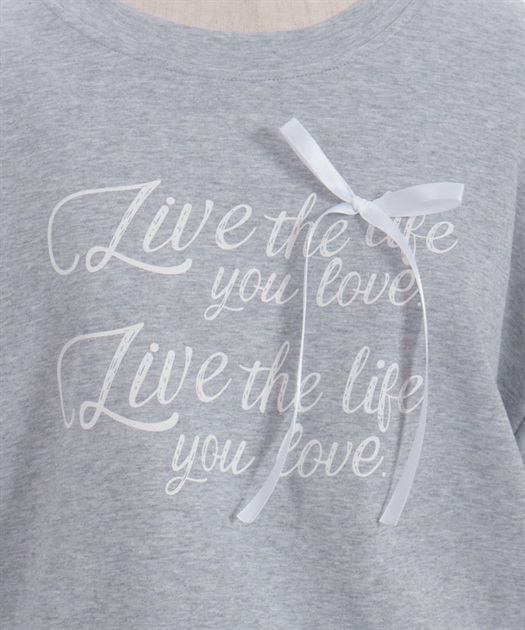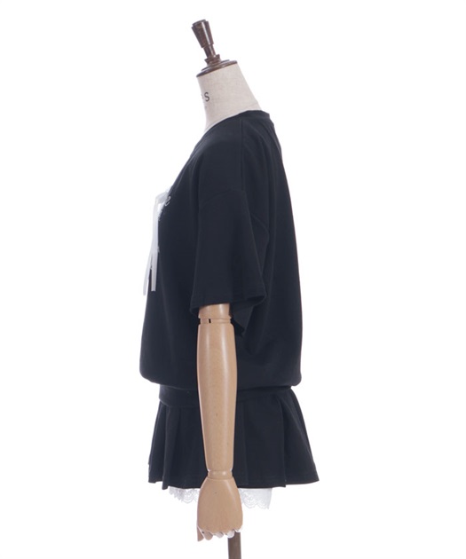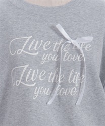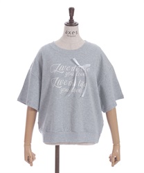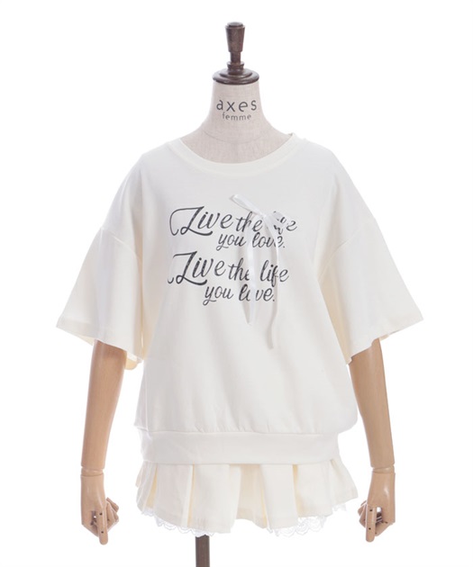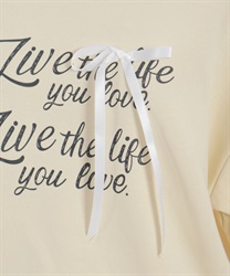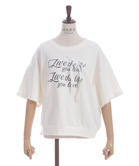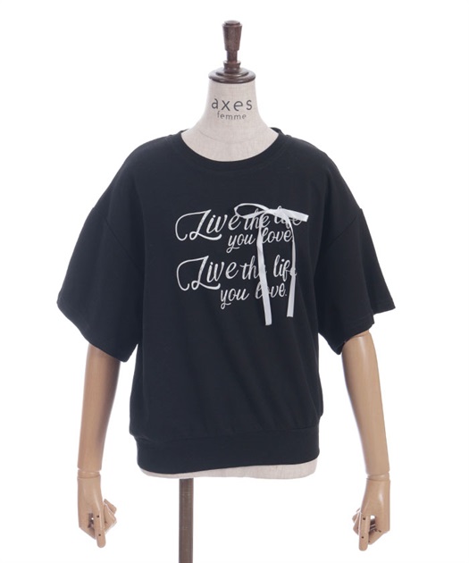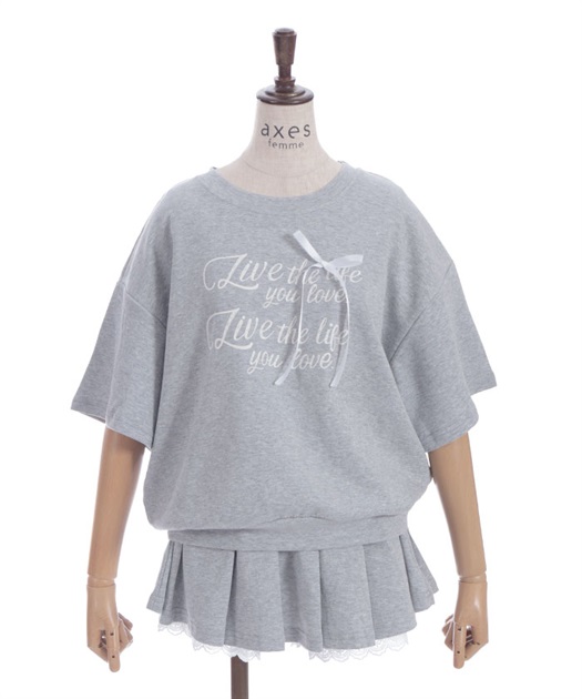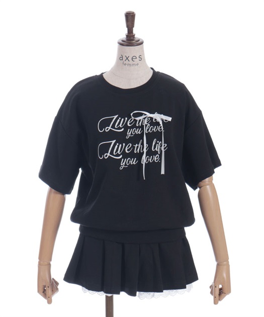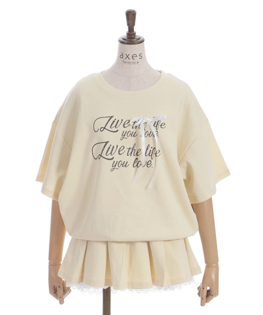トップスにはリボン付の英字プリントが施されていて、シンプルながらもさりげない個性を演出