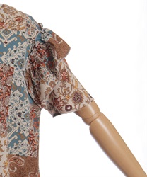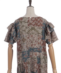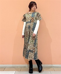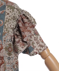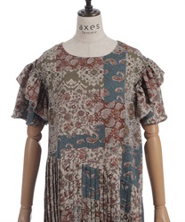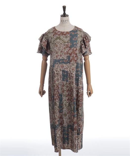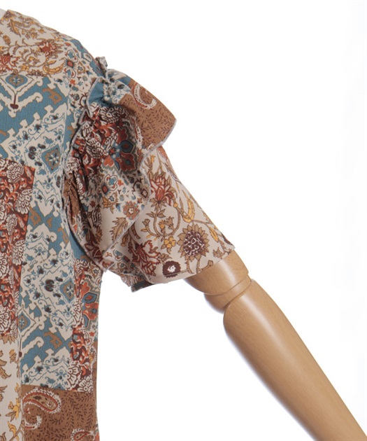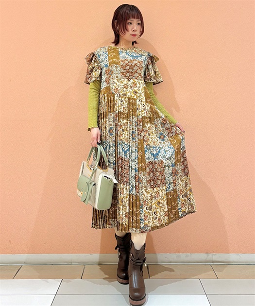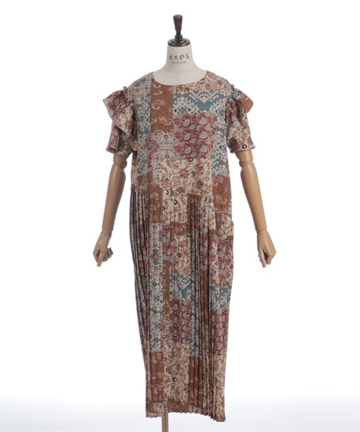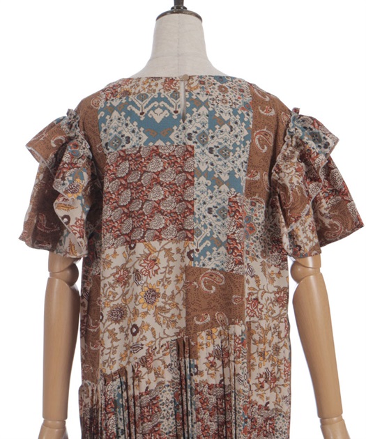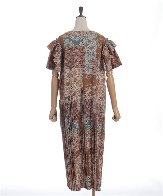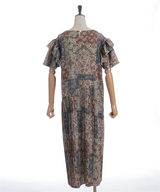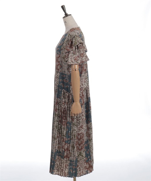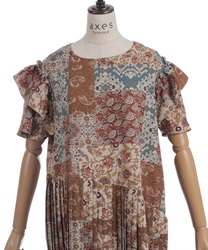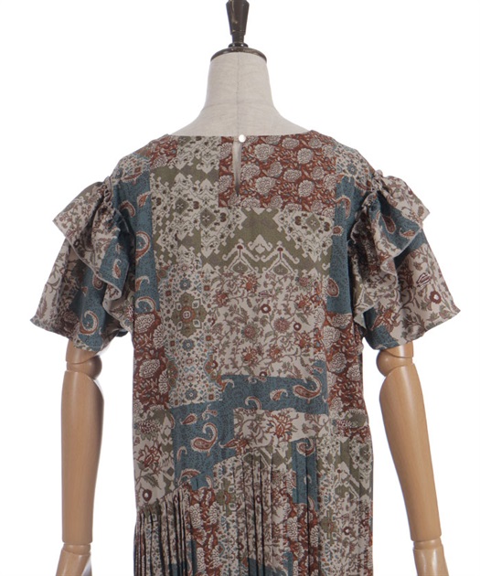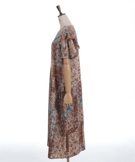 クラシカルなムード漂うパッチワーク柄が印象的なワンピース。やわらかな配色と落ち着いた柄使いで、1枚で雰囲気のあるスタイルが完成するアイテムです。
