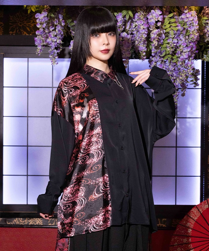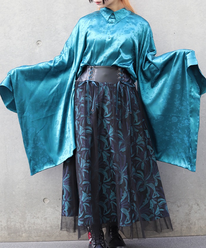 菊刺繍ジャガード切替シャツ